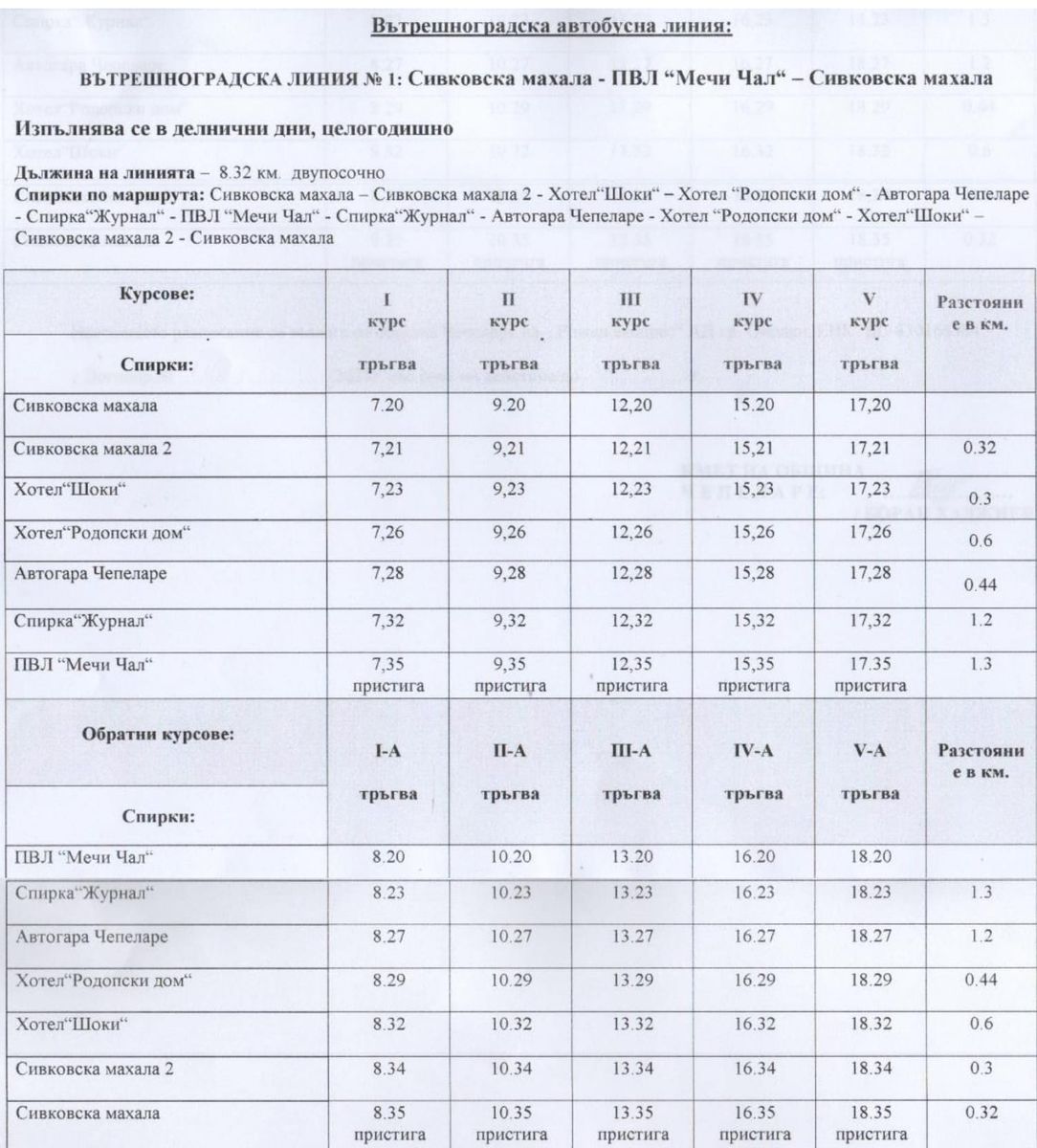 Разписание вътрешноградска транспортна линия: