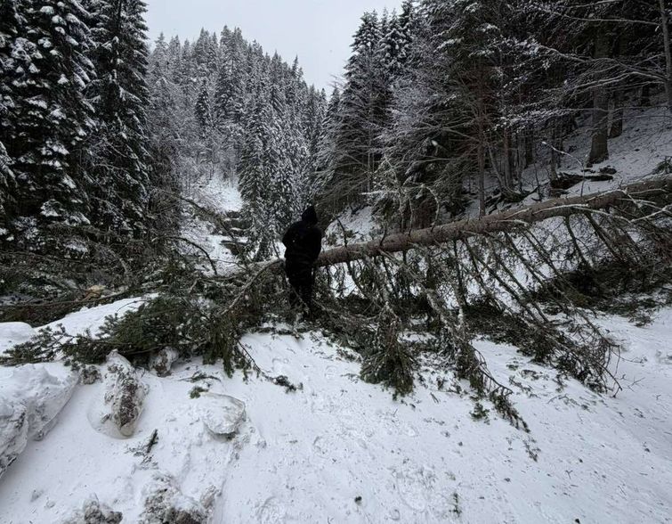 Новата снежна покривка на места e над 25 сантиметра. По няколко общински пътища има сигнали за паднали дървета, които затрудняват движението.