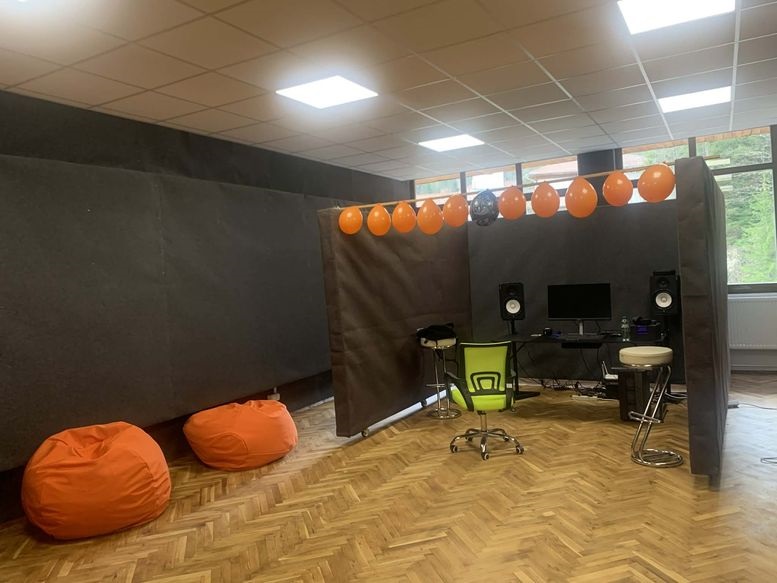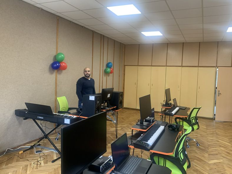 Първата зала представлява специално обособената стая за музициране, в която учениците ще разполагат с модерни работни станции, оборудвани с висок клас техника и софтуер за създаване, обработка и миксиране на музика. Тук всеки ученик може сам да създава своя музика, свои проекти, да миксират записи, да се учат да го правят по професионален начин.